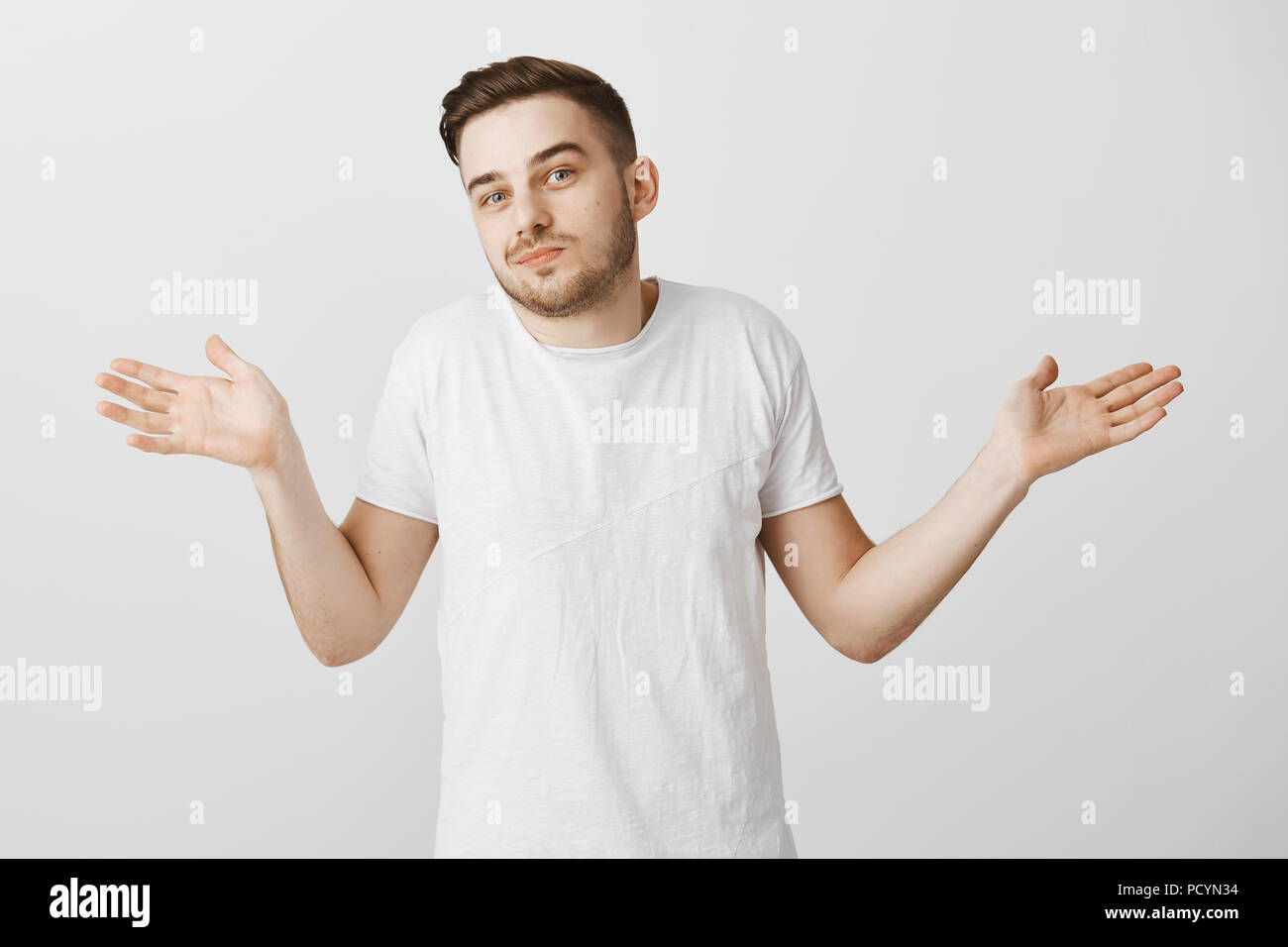 Je N Ai Aucune Idee De L Homme A Demande A Personne D Autre Careless Beau Detendue Avec Guy Non Rase Coupe Elegante En Blanc T Shirt Faire Hausser Les Epaules Geste Avec Pa Photo Stock