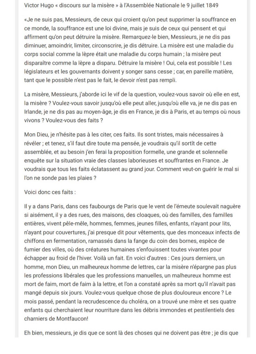 Ajouter un message à la discussion. Discours sur la misère Victor Hugo juillet 1849. Nouveaux murmures à droite La misère est une maladie du corps social comme la lèpre était une maladie du corps humain.