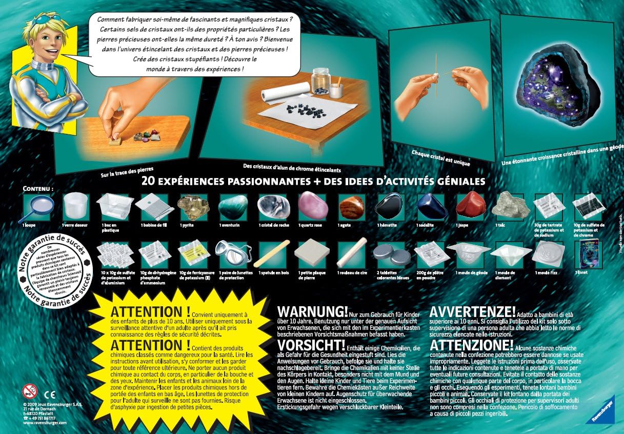 Seul petit regret la taille un peu petite des cristaux inclus dans la boite car lenfant sattend à des pierres un peu plus grosses. Fais des expériences avec plein de nouvelles substances chimiques pour créer de magnifiques cristaux. Ravensburger Cristaux et Pierres Précieuses.
